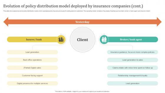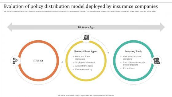 This slide showcases insurance policy distribution model which was deployed by insurers previously for selling plans to customers. The operating model consists of key tasks of parties such as client, broker or bank agent and insurer or bank. Welcome to our selection of the Improving Customer Satisfaction Evolution Of Policy Distribution Model Deployed. These are designed to help you showcase your creativity and bring your sphere to life. Planning and Innovation are essential for any business that is just starting out. This collection contains the designs that you need for your everyday presentations. All of our PowerPoints are 100Percent editable, so you can customize them to suit your needs. This multi-purpose template can be used in various situations. Grab these presentation templates today. This slide showcases insurance policy distribution model which was deployed by insurers previously for selling plans to customers. The operating model consists of key tasks of parties such as client, broker or bank agent and insurer or bank.