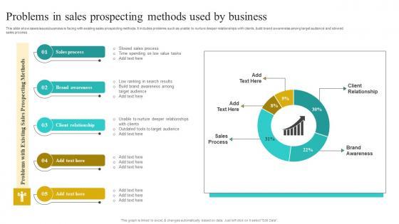 This slide showcases issues business is facing with existing sales prospecting methods. It includes problems such as unable to nurture deeper relationships with clients, build brand awareness among target audience and slowed sales process.Are you searching for a Problems In Sales Prospecting Methods Implementing Strategies To Improve Diagrams Pdf that is uncluttered, straightforward, and original Its easy to edit, and you can change the colors to suit your personal or business branding. For a presentation that expresses how much effort you have put in, this template is ideal. With all of its features, including tables, diagrams, statistics, and lists, its perfect for a business plan presentation. Make your ideas more appealing with these professional slides. Download Problems In Sales Prospecting Methods Implementing Strategies To Improve Diagrams Pdf from Slidegeeks today. This slide showcases issues business is facing with existing sales prospecting methods. It includes problems such as unable to nurture deeper relationships with clients, build brand awareness among target audience and slowed sales process.