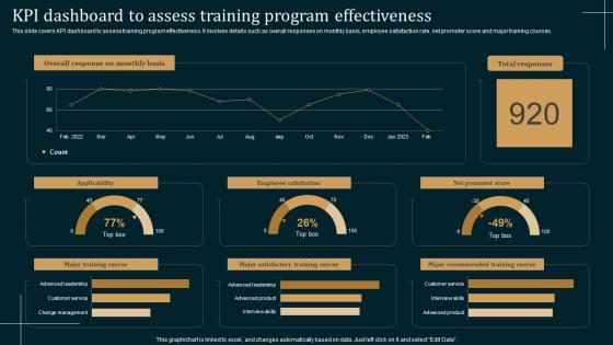 This slide covers KPI dashboard to assess training program effectiveness. It involves details such as overall responses on monthly basis, employee satisfaction rate, net promoter score and major training courses. Welcome to our selection of the KPI Dashboard To Assess Employee Performance Improvement Techniques Ideas Pdf. These are designed to help you showcase your creativity and bring your sphere to life. Planning and Innovation are essential for any business that is just starting out. This collection contains the designs that you need for your everyday presentations. All of our PowerPoints are 100 percent editable, so you can customize them to suit your needs. This multi purpose template can be used in various situations. Grab these presentation templates today This slide covers KPI dashboard to assess training program effectiveness. It involves details such as overall responses on monthly basis, employee satisfaction rate, net promoter score and major training courses.
