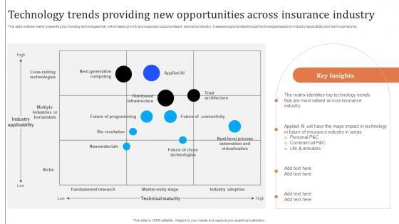This slide outlines matrix presenting top trending technologies that will increase growth and expansion opportunities in insurance industry. It assess opportunities through technologies based on industry applicability and technical maturity. This modern and well-arranged Improving Customer Satisfaction Technology Trends Providing New Opportunities Across provides lots of creative possibilities. It is very simple to customize and edit with the Powerpoint Software. Just drag and drop your pictures into the shapes. All facets of this template can be edited with Powerpoint, no extra software is necessary. Add your own material, put your images in the places assigned for them, adjust the colors, and then you can show your slides to the world, with an animated slide included. This slide outlines matrix presenting top trending technologies that will increase growth and expansion opportunities in insurance industry. It assess opportunities through technologies based on industry applicability and technical maturity.