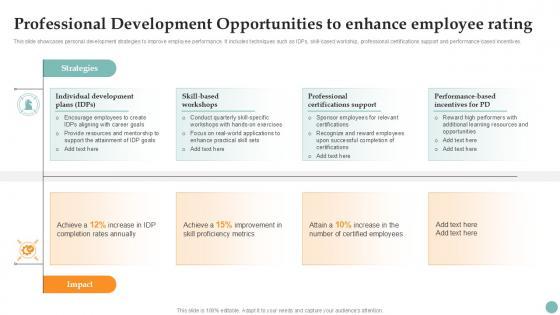 This slide showcases personal development strategies to improve employee performance. It includes techniques such as IDPs, skill-based workship, professional certifications support and performance-based incentives. The Professional Development Opportunities Improving Employee Performance PPT Slide Strategy SS V is a compilation of the most recent design trends as a series of slides. It is suitable for any subject or industry presentation, containing attractive visuals and photo spots for businesses to clearly express their messages. This template contains a variety of slides for the user to input data, such as structures to contrast two elements, bullet points, and slides for written information. Slidegeeks is prepared to create an impression. This slide showcases personal development strategies to improve employee performance. It includes techniques such as IDPs, skill-based workship, professional certifications support and performance-based incentives.