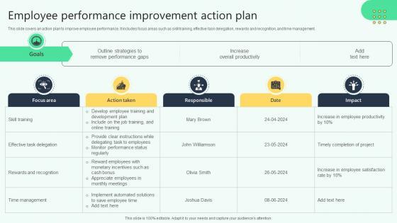 This slide covers an action plan to improve employee performance. It includes focus areas such as skill training, effective task delegation, rewards and recognition, and time management. Make sure to capture your audiences attention in your business displays with our gratis customizable Employee Performance Improvement Action Plan Analysing Hr Data For Effective Decision Making. These are great for business strategies, office conferences, capital raising or task suggestions. If you desire to acquire more customers for your tech business and ensure they stay satisfied, create your own sales presentation with these plain slides. This slide covers an action plan to improve employee performance. It includes focus areas such as skill training, effective task delegation, rewards and recognition, and time management.