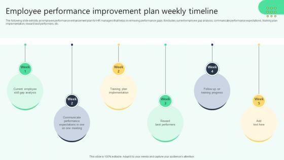 The following slide exhibits an employee performance enhancement plan for HR managers that helps in removing performance gaps. It includes current employee gap analysis, communicate performance expectations, training plan implementation, reward best performers, etc. Coming up with a presentation necessitates that the majority of the effort goes into the content and the message you intend to convey. The visuals of a PowerPoint presentation can only be effective if it supplements and supports the story that is being told. Keeping this in mind our experts created Employee Performance Improvement Plan Weekly Analysing Hr Data For Effective Decision Making to reduce the time that goes into designing the presentation. This way, you can concentrate on the message while our designers take care of providing you with the right template for the situation. The following slide exhibits an employee performance enhancement plan for HR managers that helps in removing performance gaps. It includes current employee gap analysis, communicate performance expectations, training plan implementation, reward best performers, etc.