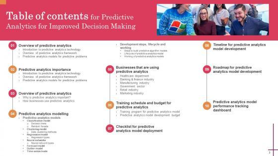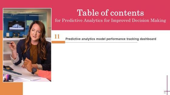 There are so many reasons you need a Table Of Contents For Predictive Analytics For Improved Decision Making Portrait Pdf. The first reason is you can not spend time making everything from scratch, Thus, Slidegeeks has made presentation templates for you too. You can easily download these templates from our website easily. Our Table Of Contents For Predictive Analytics For Improved Decision Making Portrait Pdf are topically designed to provide an attractive backdrop to any subject. Use them to look like a presentation pro.