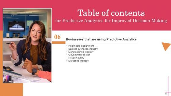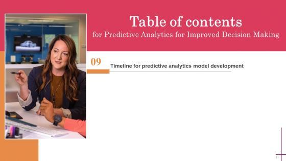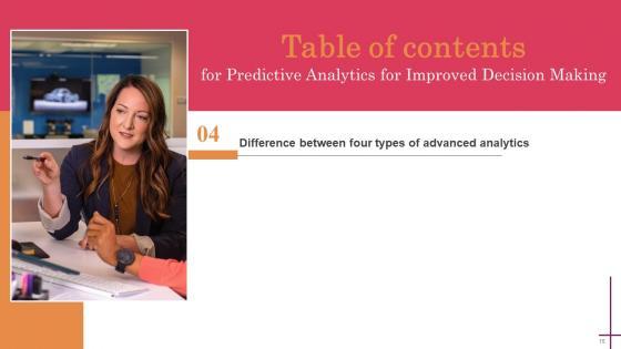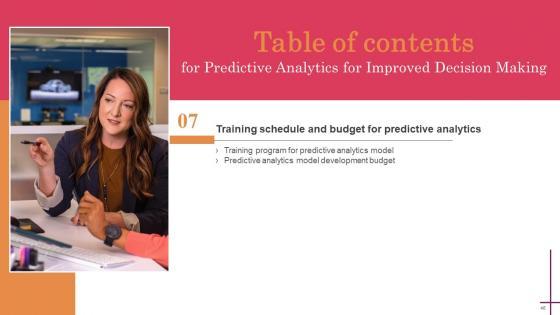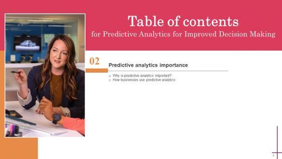 Coming up with a presentation necessitates that the majority of the effort goes into the content and the message you intend to convey. The visuals of a PowerPoint presentation can only be effective if it supplements and supports the story that is being told. Keeping this in mind our experts created Predictive Analytics For Improved Decision Making Table Of Contents Inspiration Pdf to reduce the time that goes into designing the presentation. This way, you can concentrate on the message while our designers take care of providing you with the right template for the situation. Our Predictive Analytics For Improved Decision Making Table Of Contents Inspiration Pdf are topically designed to provide an attractive backdrop to any subject. Use them to look like a presentation pro.