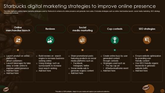 This slide highlights various digital marketing strategies used by Starbucks to enhance its online presence and generate more sales. It includes strategies such as online merchandise launch, social media marketing, SEO strategy, reviews and contests. Slidegeeks is one of the best resources for PowerPoint templates. You can download easily and regulate Starbucks Digital Marketing Strategies To Improve Online Presence Ppt Powerpoint SS for your personal presentations from our wonderful collection. A few clicks is all it takes to discover and get the most relevant and appropriate templates. Use our Templates to add a unique zing and appeal to your presentation and meetings. All the slides are easy to edit and you can use them even for advertisement purposes. This slide highlights various digital marketing strategies used by Starbucks to enhance its online presence and generate more sales. It includes strategies such as online merchandise launch, social media marketing, SEO strategy, reviews and contests.
