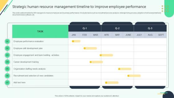 This slide outline timeline for HR managers to improve employee and business performance. It includes tasks such as recruitment process analysis, redesign hiring process, adoption of skill assessment and document review software, etc. From laying roadmaps to briefing everything in detail, our templates are perfect for you. You can set the stage with your presentation slides. All you have to do is download these easy-to-edit and customizable templates. Strategic Human Resource Management Timeline To Improve Employee Performance will help you deliver an outstanding performance that everyone would remember and praise you for. Do download this presentation today. This slide outline timeline for HR managers to improve employee and business performance. It includes tasks such as recruitment process analysis, redesign hiring process, adoption of skill assessment and document review software, etc.