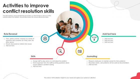 This slide mentions various activities that can be taken up within the team to improve conflict resolution skills of the members. Key activities include role reversal, skits and journaling. Want to ace your presentation in front of a live audience Our Unlocking Potential Enhancing Activities To Improve Conflict Resolution Skills can help you do that by engaging all the users towards you. Slidegeeks experts have put their efforts and expertise into creating these impeccable powerpoint presentations so that you can communicate your ideas clearly. Moreover, all the templates are customizable, and easy-to-edit and downloadable. Use these for both personal and commercial use. This slide mentions various activities that can be taken up within the team to improve conflict resolution skills of the members. Key activities include role reversal, skits and journaling.