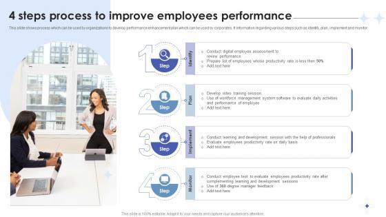 This slide shows process which can be used by organizations to develop performance enhancement plan which can be used by corporates. It information regarding various steps such as identify, plan, implement and monitor. Boost your pitch with our creative Employee Relations In Human Resource 4 Steps Process To Improve Employees Performance. Deliver an awe-inspiring pitch that will mesmerize everyone. Using these presentation templates you will surely catch everyones attention. You can browse the ppts collection on our website. We have researchers who are experts at creating the right content for the templates. So you do not have to invest time in any additional work. Just grab the template now and use them. This slide shows process which can be used by organizations to develop performance enhancement plan which can be used by corporates. It information regarding various steps such as identify, plan, implement and monitor.