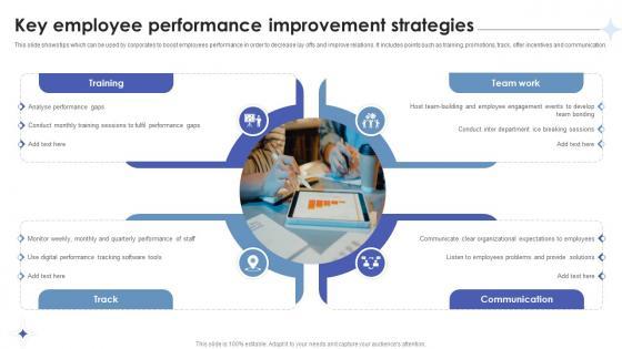 This slide shows tips which can be used by corporates to boost employees performance in order to decrease lay offs and improve relations. It includes points such as training, promotions, track, offer incentives and communication. Formulating a presentation can take up a lot of effort and time, so the content and message should always be the primary focus. The visuals of the PowerPoint can enhance the presenters message, so our Employee Relations In Human Resource Key Employee Performance Improvement Strategies was created to help save time. Instead of worrying about the design, the presenter can concentrate on the message while our designers work on creating the ideal templates for whatever situation is needed. Slidegeeks has experts for everything from amazing designs to valuable content, we have put everything into Employee Relations In Human Resource Key Employee Performance Improvement Strategies This slide shows tips which can be used by corporates to boost employees performance in order to decrease lay offs and improve relations. It includes points such as training, promotions, track, offer incentives and communication.