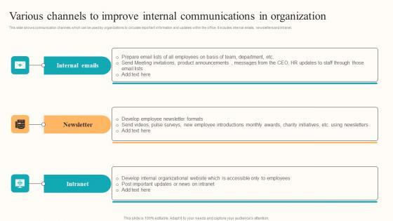 This slide shows communication channels which can be used by organizations to circulate important information and updates within the office. It includes internal emails, newsletters and intranet. The Implementing Internal Marketing Various Channels To Improve Internal Communications Microsoft PDF is a compilation of the most recent design trends as a series of slides. It is suitable for any subject or industry presentation, containing attractive visuals and photo spots for businesses to clearly express their messages. This template contains a variety of slides for the user to input data, such as structures to contrast two elements, bullet points, and slides for written information. Slidegeeks is prepared to create an impression.