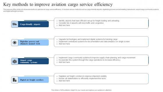 The purpose of this slide is to showcase tactics to optimize air cargo service efficiency. It involves various methods such as cargo-friendly airports, digitalizing process and eliminating manual work, airport cargo community systems and digital airfreight corridors. Showcasing this set of slides titled Key Methods To Improve Aviation Cargo Service Efficiency Pictures Pdf. The topics addressed in these templates are Community Systems, Freight Corridors, Digitalize Process. All the content presented in this PPT design is completely editable. Download it and make adjustments in color, background, font etc. as per your unique business setting. The purpose of this slide is to showcase tactics to optimize air cargo service efficiency. It involves various methods such as cargo-friendly airports, digitalizing process and eliminating manual work, airport cargo community systems and digital airfreight corridors.
