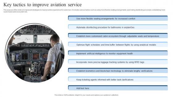 The purpose of this slide is to represent strategies to improve airline experience for customers. It includes various tactics such as using more flexible seating arrangements, automating disinfecting procedure, establishing more customized cabin ecosystem etc. Pitch your topic with ease and precision using this Key Tactics To Improve Aviation Service Background Pdf. This layout presents information on Seating Arrangements, Automate Disinfecting, Customized Cabin Ecosystem. It is also available for immediate download and adjustment. So, changes can be made in the color, design, graphics or any other component to create a unique layout. The purpose of this slide is to represent strategies to improve airline experience for customers. It includes various tactics such as using more flexible seating arrangements, automating disinfecting procedure, establishing more customized cabin ecosystem etc.