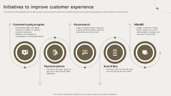This slide represents strategies taken by HandM group to enhance customer experience. It includes details such as customer loyalty program, payment options, visual search, etc. Crafting an eye-catching presentation has never been more straightforward. Let your presentation shine with this tasteful yet straightforward Initiatives To Improve Customer Experience Clothing Retailer Company Profile CP SS V template. It offers a minimalistic and classy look that is great for making a statement. The colors have been employed intelligently to add a bit of playfulness while still remaining professional. Construct the ideal Initiatives To Improve Customer Experience Clothing Retailer Company Profile CP SS V that effortlessly grabs the attention of your audience Begin now and be certain to wow your customers This slide represents strategies taken by HandM group to enhance customer experience. It includes details such as customer loyalty program, payment options, visual search, etc.