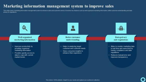 This slide covers marketing information management system to enhance sales and customer service. It involves key features such as well organized marketing information, better customer understanding and data privacy and regulations. This Marketing Information Management System To Improve Sales Background PDF is perfect for any presentation, be it in front of clients or colleagues. It is a versatile and stylish solution for organizing your meetings. The Marketing Information Management System To Improve Sales Background PDF features a modern design for your presentation meetings. The adjustable and customizable slides provide unlimited possibilities for acing up your presentation. Slidegeeks has done all the homework before launching the product for you. So, do not wait, grab the presentation templates today