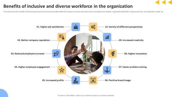 This slide covers the benefits of introducing diversity and inclusion parameter within the company on various elements such as innovation and creativity, organizational flexibility, employee turnover, job satisfaction, profits, etc. If your project calls for a presentation, then Slidegeeks is your go to partner because we have professionally designed, easy to edit templates that are perfect for any presentation. After downloading, you can easily edit Workforce Productivity Improvement Benefits Of Inclusive And Diverse Workforce In The Infographics Pdf and make the changes accordingly. You can rearrange slides or fill them with different images. Check out all the handy templates This slide covers the benefits of introducing diversity and inclusion parameter within the company on various elements such as innovation and creativity, organizational flexibility, employee turnover, job satisfaction, profits, etc.