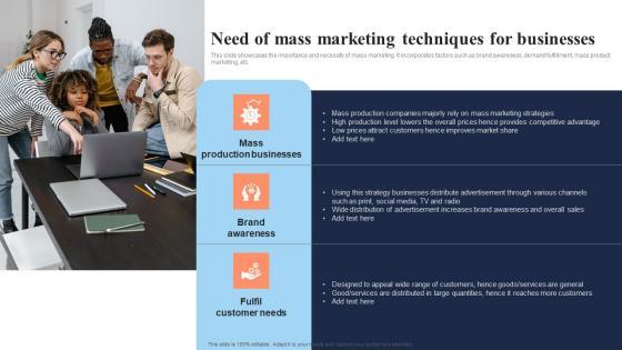 This slide showcases the importance and necessity of mass marketing. It incorporates factors such as brand awareness, demand fulfillment, mass product marketing, etc. Coming up with a presentation necessitates that the majority of the effort goes into the content and the message you intend to convey. The visuals of a PowerPoint presentation can only be effective if it supplements and supports the story that is being told. Keeping this in mind our experts created Need Of Mass Marketing Techniques For Businesses In Depth Overview Of Mass Designs Pdf to reduce the time that goes into designing the presentation. This way, you can concentrate on the message while our designers take care of providing you with the right template for the situation. This slide showcases the importance and necessity of mass marketing. It incorporates factors such as brand awareness, demand fulfillment, mass product marketing, etc.