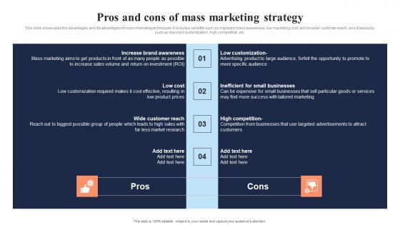 This slide showcases the advantages and disadvantages of mass marketing techniques. It includes benefits such as improved brand awareness, low marketing cost, and broader customer reach, and drawbacks such as standard customization, high competition, etc. Explore a selection of the finest Pros And Cons Of Mass Marketing Strategy In Depth Overview Of Mass Infographics Pdf here. With a plethora of professionally designed and pre-made slide templates, you can quickly and easily find the right one for your upcoming presentation. You can use our Pros And Cons Of Mass Marketing Strategy In Depth Overview Of Mass Infographics Pdf to effectively convey your message to a wider audience. Slidegeeks has done a lot of research before preparing these presentation templates. The content can be personalized and the slides are highly editable. Grab templates today from Slidegeeks. This slide showcases the advantages and disadvantages of mass marketing techniques. It includes benefits such as improved brand awareness, low marketing cost, and broader customer reach, and drawbacks such as standard customization, high competition, etc.