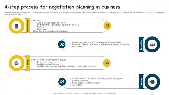 This slide highlights the 4 step process to be followed during negotiating planning. The purpose of this slide is to help the negotiator conduct a successful negotiation through use of strategic techniques and tactics in order to help achieve business goal. Showcasing this set of slides titled 4 Step Process For Negotiation Planning In Business Sample Pdf The topics addressed in these templates are Possible Agreement, Involves Processes, Assess Negotiation Process All the content presented in this PPT design is completely editable. Download it and make adjustments in color, background, font etc. as per your unique business setting. This slide highlights the 4 step process to be followed during negotiating planning. The purpose of this slide is to help the negotiator conduct a successful negotiation through use of strategic techniques and tactics in order to help achieve business goal.