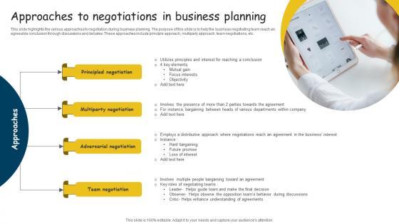 This slide highlights the various approaches to negotiation during business planning. The purpose of this slide is to help the business negotiating team reach an agreeable conclusion through discussions and debates. These approaches include principle approach, multiparty approach, team negotiations, etc.Pitch your topic with ease and precision using this Approaches To Negotiations In Business Planning Microsoft Pdf This layout presents information on Principled Negotiation, Multiparty Negotiation, Adversarial Negotiation It is also available for immediate download and adjustment. So, changes can be made in the color, design, graphics or any other component to create a unique layout. This slide highlights the various approaches to negotiation during business planning. The purpose of this slide is to help the business negotiating team reach an agreeable conclusion through discussions and debates. These approaches include principle approach, multiparty approach, team negotiations, etc.
