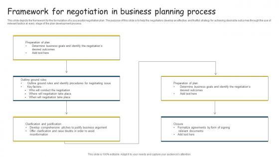 This slide depicts the framework for the formulation of a successful negotiation plan. The purpose of this slide is to help the negotiators develop an effective and fruitful strategy for achieving desirable outcomes through the use of relevant tactics at every stage of the plan development process. Showcasing this set of slides titled Framework For Negotiation In Business Planning Process Portrait Pdf The topics addressed in these templates are Preparation Plan, Determine Business, Desired Outcomes All the content presented in this PPT design is completely editable. Download it and make adjustments in color, background, font etc. as per your unique business setting. This slide depicts the framework for the formulation of a successful negotiation plan. The purpose of this slide is to help the negotiators develop an effective and fruitful strategy for achieving desirable outcomes through the use of relevant tactics at every stage of the plan development process.