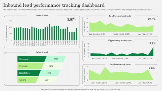 This slide covers the KPI dashboard for evaluating inbound lead performance. It includes metrics such as lead to opportunity ratio, opportunity to win ratio, lead conversion ratio, inbound leads, and leads in the sales funnel. The Inbound Lead Performance Tracking Dashboard Enhancing Client Lead Conversion Rates Structure PDF is a compilation of the most recent design trends as a series of slides. It is suitable for any subject or industry presentation, containing attractive visuals and photo spots for businesses to clearly express their messages. This template contains a variety of slides for the user to input data, such as structures to contrast two elements, bullet points, and slides for written information. Slidegeeks is prepared to create an impression.