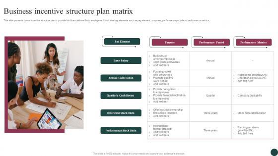 This slide presents bonus incentive structure plan to provide fair financial benefits to employees. It includes key elements such as pay element, proposer, performance period and performance metrics. Showcasing this set of slides titled Business Incentive Structure Plan Matrix Slides Pdf. The topics addressed in these templates are Annual Cash Bonus, Quarterly Cash Bonus, Restricted Stock Units. All the content presented in this PPT design is completely editable. Download it and make adjustments in color, background, font etc. as per your unique business setting. This slide presents bonus incentive structure plan to provide fair financial benefits to employees. It includes key elements such as pay element, proposer, performance period and performance metrics.