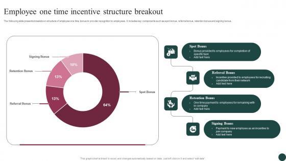The following slide presents breakdown structure of employee one time bonus to provide recognition to employees. It includes key components such as spot bonus, referral bonus, retention bonus and signing bonus. Pitch your topic with ease and precision using this Employee One Time Incentive Structure Breakout Topics Pdf. This layout presents information on Spot Bonus, Referral Bonus, Retention Bonus. It is also available for immediate download and adjustment. So, changes can be made in the color, design, graphics or any other component to create a unique layout. The following slide presents breakdown structure of employee one time bonus to provide recognition to employees. It includes key components such as spot bonus, referral bonus, retention bonus and signing bonus.