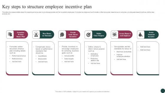 This slide showcases multiple steps for preparing an bonus plan to provide appropriate and fair rewards to employees. It includes key steps such as formulate written bonus plan, base bonus on outcomes, provide goals based incentives, define clear purpose, etc. Pitch your topic with ease and precision using this Key Steps To Structure Employee Incentive Plan Guidelines Pdf. This layout presents information on Prefer Financial Incentive, Base Bonus On Outcomes. It is also available for immediate download and adjustment. So, changes can be made in the color, design, graphics or any other component to create a unique layout. This slide showcases multiple steps for preparing an bonus plan to provide appropriate and fair rewards to employees. It includes key steps such as formulate written bonus plan, base bonus on outcomes, provide goals based incentives, define clear purpose, etc.