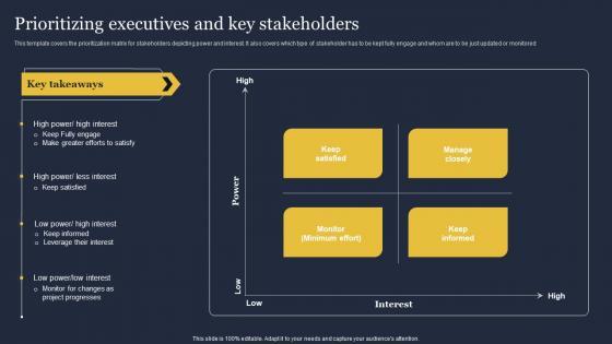 This template covers the prioritization matrix for stakeholders depicting power and interest. It also covers which type of stakeholder has to be kept fully engage and whom are to be just updated or monitored If your project calls for a presentation, then Slidegeeks is your go to partner because we have professionally designed, easy to edit templates that are perfect for any presentation. After downloading, you can easily edit Prioritizing Executives And Key Stakeholders Critical Incident Communication Mockup Pdf and make the changes accordingly. You can rearrange slides or fill them with different images. Check out all the handy templates This template covers the prioritization matrix for stakeholders depicting power and interest. It also covers which type of stakeholder has to be kept fully engage and whom are to be just updated or monitored