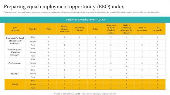 Equal employment opportunity index is prepared by companies to maintain diversity and inclusion at all levels in the organization. It reflects how many people of different backgrounds are hired in the company at each level. Are you searching for a Preparing Equal Employment Administering Diversity And Inclusion At Workplace Inspiration Pdf that is uncluttered, straightforward, and original Its easy to edit, and you can change the colors to suit your personal or business branding. For a presentation that expresses how much effort you have put in, this template is ideal With all of its features, including tables, diagrams, statistics, and lists, its perfect for a business plan presentation. Make your ideas more appealing with these professional slides. Download Preparing Equal Employment Administering Diversity And Inclusion At Workplace Inspiration Pdf from Slidegeeks today. Equal employment opportunity index is prepared by companies to maintain diversity and inclusion at all levels in the organization. It reflects how many people of different backgrounds are hired in the company at each level.
