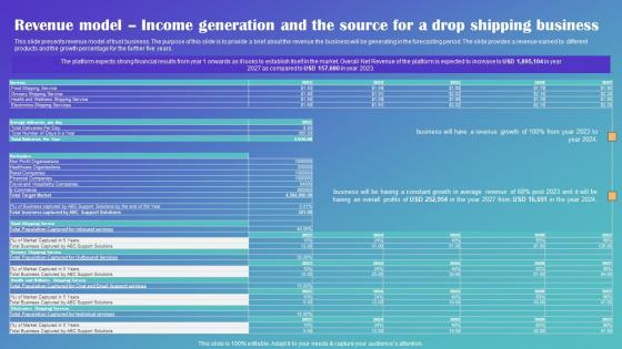 This slide presents revenue model of trust business. The purpose of this slide is to provide a brief about the revenue the business will be generating in the forecasting period. The slide provides a revenue earned by different products and the growth percentage for the further five years. If you are looking for a format to display your unique thoughts, then the professionally designed Revenue Model Income Generation And The Source Drop Shipping Business Plan Formats Pdf is the one for you. You can use it as a Google Slides template or a PowerPoint template. Incorporate impressive visuals, symbols, images, and other charts. Modify or reorganize the text boxes as you desire. Experiment with shade schemes and font pairings. Alter, share or cooperate with other people on your work. Download Revenue Model Income Generation And The Source Drop Shipping Business Plan Formats Pdf and find out how to give a successful presentation. Present a perfect display to your team and make your presentation unforgettable. This slide presents revenue model of trust business. The purpose of this slide is to provide a brief about the revenue the business will be generating in the forecasting period. The slide provides a revenue earned by different products and the growth percentage for the further five years.