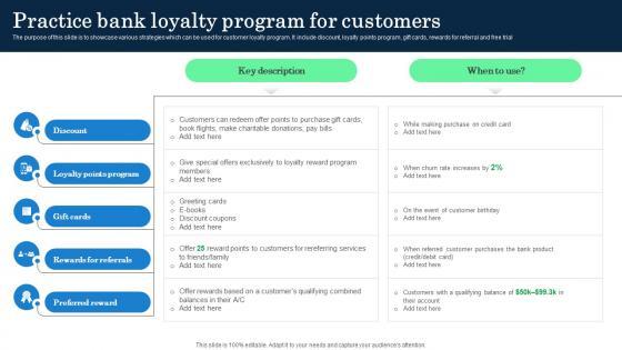 The purpose of this slide is to showcase various strategies which can be used for customer loyalty program. It include discount, loyalty points program, gift cards, rewards for referral and free trial. From laying roadmaps to briefing everything in detail, our templates are perfect for you. You can set the stage with your presentation slides. All you have to do is download these easy-to-edit and customizable templates. Practice Bank Loyalty Program For Customers Incorporating Banking Operational Growth will help you deliver an outstanding performance that everyone would remember and praise you for. Do download this presentation today. The purpose of this slide is to showcase various strategies which can be used for customer loyalty program. It include discount, loyalty points program, gift cards, rewards for referral and free trial
