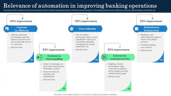 The purpose of the mentioned slide is to showcase the various benefits of utilizing automation to enhance banking operations. The benefits include increase in efficiency, increase in data handling, cost reduction, etc. Present like a pro with Relevance Of Automation In Improving Banking Incorporating Banking Operational Growth. Create beautiful presentations together with your team, using our easy-to-use presentation slides. Share your ideas in real-time and make changes on the fly by downloading our templates. So whether you are in the office, on the go, or in a remote location, you can stay in sync with your team and present your ideas with confidence. With Slidegeeks presentation got a whole lot easier. Grab these presentations today. The purpose of the mentioned slide is to showcase the various benefits of utilizing automation to enhance banking operations. The benefits include increase in efficiency, increase in data handling, cost reduction, etc.