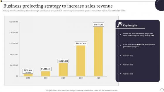 Following slides shows the strategy of business planning to generate more of revenue which will assist in more productive and make operation in more profitable .It covers the period from 2019 to 2023 Pitch your topic with ease and precision using this Business Projecting Strategy To Increase Sales Revenue Background Pdf. This layout presents information on Key Insights, Revenue Projections, Business Projecting Strategy. It is also available for immediate download and adjustment. So, changes can be made in the color, design, graphics or any other component to create a unique layout. Following slides shows the strategy of business planning to generate more of revenue which will assist in more productive and make operation in more profitable .It covers the period from 2019 to 2023