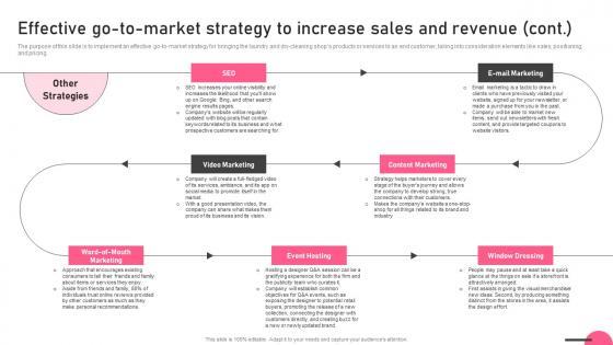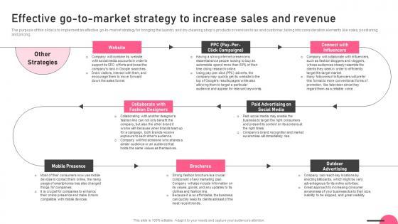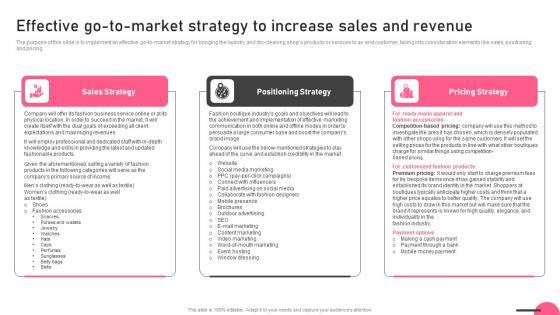 The purpose of this slide is to implement an effective go-to-market strategy for bringing the laundry and dry-cleaning shops products or services to an end customer, taking into consideration elements like sales, positioning, and pricing. Find highly impressive Effective Go To Market Strategy To Increase Sales And Revenue Boutique Business Portrait Pdf on Slidegeeks to deliver a meaningful presentation. You can save an ample amount of time using these presentation templates. No need to worry to prepare everything from scratch because Slidegeeks experts have already done a huge research and work for you. You need to download Effective Go To Market Strategy To Increase Sales And Revenue Boutique Business Portrait Pdf for your upcoming presentation. All the presentation templates are 100 percent editable and you can change the color and personalize the content accordingly. Download now The purpose of this slide is to implement an effective go-to-market strategy for bringing the laundry and dry-cleaning shops products or services to an end customer, taking into consideration elements like sales, positioning, and pricing.