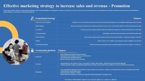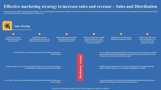 The purpose of this slide is to implement an effective go-to-market strategy for bringing the companys products or services to an end customer taking into consideration elements like sales and distribution. It includes details related to social media presence, selling products to customers, etc. Do you have an important presentation coming up Are you looking for something that will make your presentation stand out from the rest Look no further than Effective Marketing Strategy To Increase Sales And Revenue Sales Export Business Plan Summary Pdf With our professional designs, you can trust that your presentation will pop and make delivering it a smooth process. And with Slidegeeks, you can trust that your presentation will be unique and memorable. So why wait Grab Effective Marketing Strategy To Increase Sales And Revenue Sales Export Business Plan Summary Pdf today and make your presentation stand out from the rest. The purpose of this slide is to implement an effective go-to-market strategy for bringing the companys products or services to an end customer taking into consideration elements like sales and distribution. It includes details related to social media presence, selling products to customers, etc.