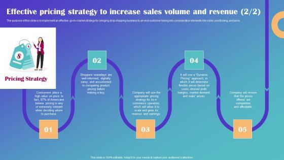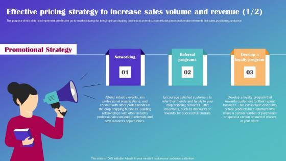 The purpose of this slide is to implement an effective go-to-market strategy for bringing drop shipping business to an end customer taking into consideration elements like sales, positioning, and price. Take your projects to the next level with our ultimate collection of Effective Sales Strategies To Increase Sales Volume And Revenue Drop Shipping Business Plan Summary Pdf Slidegeeks has designed a range of layouts that are perfect for representing task or activity duration, keeping track of all your deadlines at a glance. Tailor these designs to your exact needs and give them a truly corporate look with your own brand colors they well make your projects stand out from the rest. The purpose of this slide is to implement an effective go-to-market strategy for bringing drop shipping business to an end customer taking into consideration elements like sales, positioning, and price.