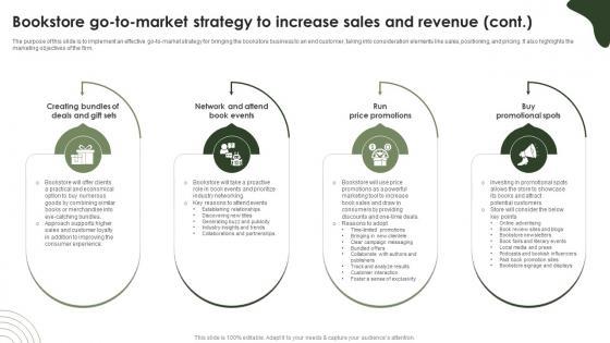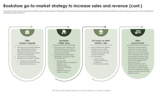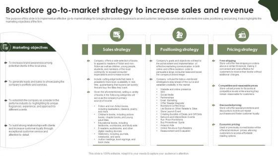 The purpose of this slide is to implement an effective go-to-market strategy for bringing the bookstore business to an end customer, taking into consideration elements like sales, positioning, and pricing. It also highlights the marketing objectives of the firm. There are so many reasons you need a Online Bookstore Business Plan Bookstore Go To Market Strategy To Increase Sales And Revenue BP SS V. The first reason is you can not spend time making everything from scratch, Thus, Slidegeeks has made presentation templates for you too. You can easily download these templates from our website easily. The purpose of this slide is to implement an effective go-to-market strategy for bringing the bookstore business to an end customer, taking into consideration elements like sales, positioning, and pricing. It also highlights the marketing objectives of the firm.