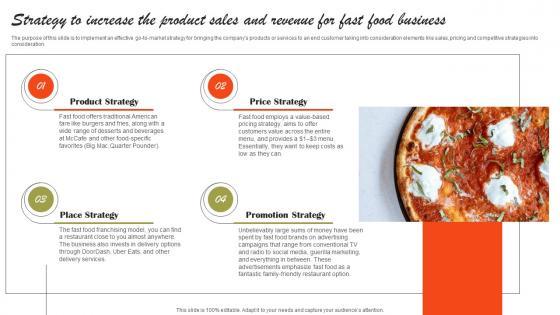 The purpose of this slide is to implement an effective go-to-market strategy for bringing the companys products or services to an end customer taking into consideration elements like sales, pricing and competitive strategies.into consideration. Create an editable Strategy To Increase The Product Sales And Revenue For Fast Food Business Plan Template Pdf that communicates your idea and engages your audience. Whether you are presenting a business or an educational presentation, pre-designed presentation templates help save time. Strategy To Increase The Product Sales And Revenue For Fast Food Business Plan Template Pdf is highly customizable and very easy to edit, covering many different styles from creative to business presentations. Slidegeeks has creative team members who have crafted amazing templates. So, go and get them without any delay. The purpose of this slide is to implement an effective go-to-market strategy for bringing the companys products or services to an end customer taking into consideration elements like sales, pricing and competitive strategies.into consideration.