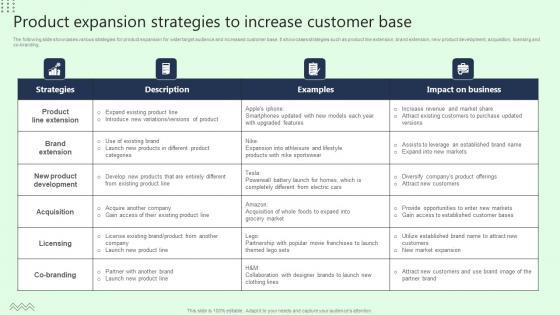 The following slide showcases various strategies for product expansion for wider target audience and increased customer base. It showcases strategies such as product line extension, brand extension, new product development, acquisition, licensing and co-branding. Slidegeeks is here to make your presentations a breeze with Product Expansion Strategies To Increase Customer Base Designs PDF With our easy-to-use and customizable templates, you can focus on delivering your ideas rather than worrying about formatting. With a variety of designs to choose from, you are sure to find one that suits your needs. And with animations and unique photos, illustrations, and fonts, you can make your presentation pop. So whether you are giving a sales pitch or presenting to the board, make sure to check out Slidegeeks first