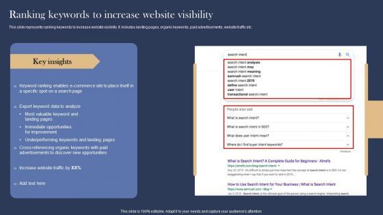 This slide represents ranking keywords to increase website visibility. It includes landing pages, organic keywords, paid advertisements, website traffic etc. Presenting this PowerPoint presentation, titled Ranking Keywords Increase Management And Marketing Strategies For E Commerce Diagrams Pdf, with topics curated by our researchers after extensive research. This editable presentation is available for immediate download and provides attractive features when used. Download now and captivate your audience. Presenting this Ranking Keywords Increase Management And Marketing Strategies For E Commerce Diagrams Pdf. Our researchers have carefully researched and created these slides with all aspects taken into consideration. This is a completely customizable Ranking Keywords Increase Management And Marketing Strategies For E Commerce Diagrams Pdf that is available for immediate downloading. Download now and make an impact on your audience. Highlight the attractive features available with our PPTs. This slide represents ranking keywords to increase website visibility. It includes landing pages, organic keywords, paid advertisements, website traffic etc.