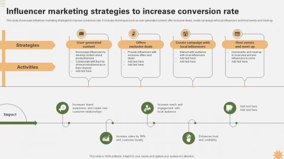 This slide showcases influencer marketing strategies to improve conversion rate. It includes techniques such as user-generated content, offer exclusive deals, create campaign wit local influencers and Host events and meet-up. Coming up with a presentation necessitates that the majority of the effort goes into the content and the message you intend to convey. The visuals of a PowerPoint presentation can only be effective if it supplements and supports the story that is being told. Keeping this in mind our experts created Influencer Marketing Strategies To Increase Strategy For Launching A Financial Strategy SS V to reduce the time that goes into designing the presentation. This way, you can concentrate on the message while our designers take care of providing you with the right template for the situation. This slide showcases influencer marketing strategies to improve conversion rate. It includes techniques such as user-generated content, offer exclusive deals, create campaign wit local influencers and Host events and meet-up.