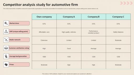 This slide represents competitor analysis for automobile organizations. It includes parameters for evaluation such as market share, unique selling point, dealer network, etc. Want to ace your presentation in front of a live audience Our Competitor Analysis Study For Automotive Firm Promotional Strategies To Increase Template PDF can help you do that by engaging all the users towards you. Slidegeeks experts have put their efforts and expertise into creating these impeccable powerpoint presentations so that you can communicate your ideas clearly. Moreover, all the templates are customizable, and easy-to-edit and downloadable. Use these for both personal and commercial use. This slide represents competitor analysis for automobile organizations. It includes parameters for evaluation such as market share, unique selling point, dealer network, etc.