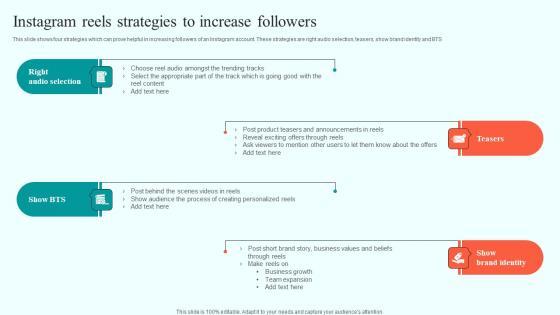This slide shows four strategies which can prove helpful in increasing followers of an Instagram account. These strategies are right audio selection, teasers, show brand identity and BTS. This modern and well-arranged Social Media Marketing To Enhance Instagram Reels Strategies To Increase Followers MKT SS V provides lots of creative possibilities. It is very simple to customize and edit with the Powerpoint Software. Just drag and drop your pictures into the shapes. All facets of this template can be edited with Powerpoint, no extra software is necessary. Add your own material, put your images in the places assigned for them, adjust the colors, and then you can show your slides to the world, with an animated slide included. This slide shows four strategies which can prove helpful in increasing followers of an Instagram account. These strategies are right audio selection, teasers, show brand identity and BTS.