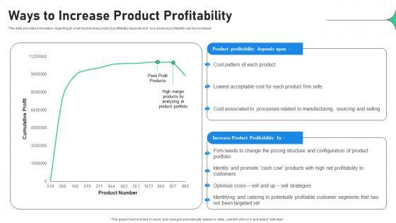 This slide provides information regarding at what factors does product profitability depends and how product profitability can be increased. Explore a selection of the finest Ways To Increase Product Profitability Increasing Profitability Through Better Product here. With a plethora of professionally designed and pre-made slide templates, you can quickly and easily find the right one for your upcoming presentation. You can use our Ways To Increase Product Profitability Increasing Profitability Through Better Product to effectively convey your message to a wider audience. Slidegeeks has done a lot of research before preparing these presentation templates. The content can be personalized and the slides are highly editable. Grab templates today from Slidegeeks. This slide provides information regarding at what factors does product profitability depends and how product profitability can be increased.