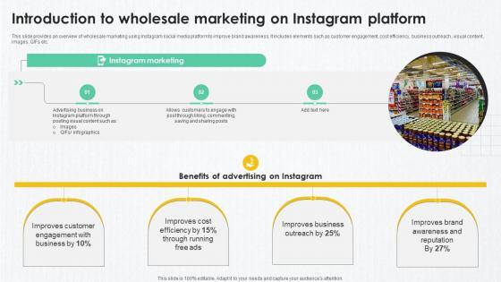 This slide provides an overview of wholesale marketing using Instagram social media platform to improve brand awareness. It includes elements such as customer engagement, cost efficiency, business outreach , visual content, images, GIFs etc. Find a pre-designed and impeccable B2B Marketing Techniques To Increase Introduction To Wholesale Marketing On Instagram. The templates can ace your presentation without additional effort. You can download these easy-to-edit presentation templates to make your presentation stand out from others. So, what are you waiting for Download the template from Slidegeeks today and give a unique touch to your presentation. This slide provides an overview of wholesale marketing using Instagram social media platform to improve brand awareness. It includes elements such as customer engagement, cost efficiency, business outreach , visual content, images, GIFs etc.