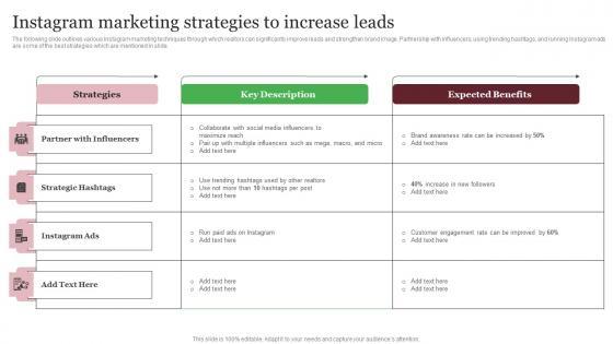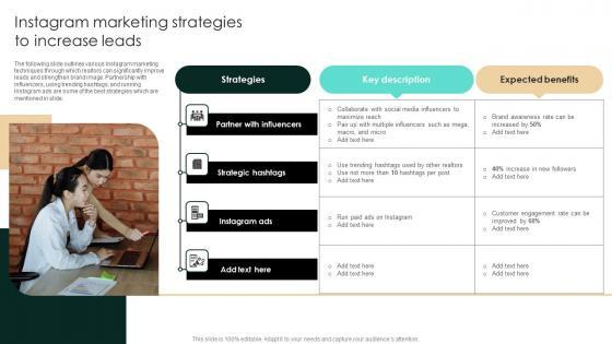 The following slide outlines various Instagram marketing techniques through which realtors can significantly improve leads and strengthen brand image. Partnership with influencers, using trending hashtags, and running Instagram ads are some of the best strategies which are mentioned in slide. Slidegeeks is here to make your presentations a breeze with Instagram Marketing Strategies To Increase Leads Portrait PDF With our easy-to-use and customizable templates, you can focus on delivering your ideas rather than worrying about formatting. With a variety of designs to choose from, you are sure to find one that suits your needs. And with animations and unique photos, illustrations, and fonts, you can make your presentation pop. So whether you are giving a sales pitch or presenting to the board, make sure to check out Slidegeeks first