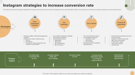 This slide showcases the Instagram strategies to increase lead conversion rate. It includes strategies such as user generated content, use Hashtags, live content and contests and giveaways and its positive impact. This modern and well arranged Instagram Strategies To Increase Conversion Rate Penetrating Markets With Financial Strategy SS V provides lots of creative possibilities. It is very simple to customize and edit with the Powerpoint Software. Just drag and drop your pictures into the shapes. All facets of this template can be edited with Powerpoint, no extra software is necessary. Add your own material, put your images in the places assigned for them, adjust the colors, and then you can show your slides to the world, with an animated slide included. This slide showcases the Instagram strategies to increase lead conversion rate. It includes strategies such as user generated content, use Hashtags, live content and contests and giveaways and its positive impact.