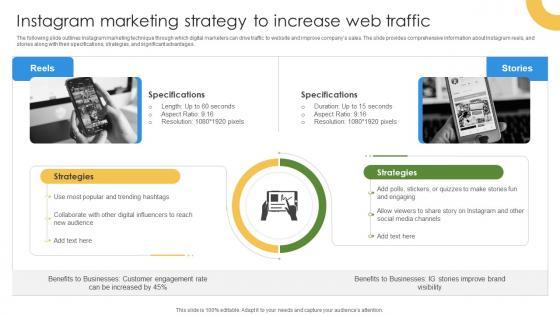 The following slide outlines Instagram marketing technique through which digital marketers can drive traffic to website and improve companys sales. The slide provides comprehensive information about Instagram reels, and stories along with their specifications, strategies, and significant advantages. Make sure to capture your audiences attention in your business displays with our gratis customizable Marketing Growth Strategy Instagram Marketing Strategy To Increase Web Traffic Strategy SS V. These are great for business strategies, office conferences, capital raising or task suggestions. If you desire to acquire more customers for your tech business and ensure they stay satisfied, create your own sales presentation with these plain slides. The following slide outlines Instagram marketing technique through which digital marketers can drive traffic to website and improve companys sales. The slide provides comprehensive information about Instagram reels, and stories along with their specifications, strategies, and significant advantages.